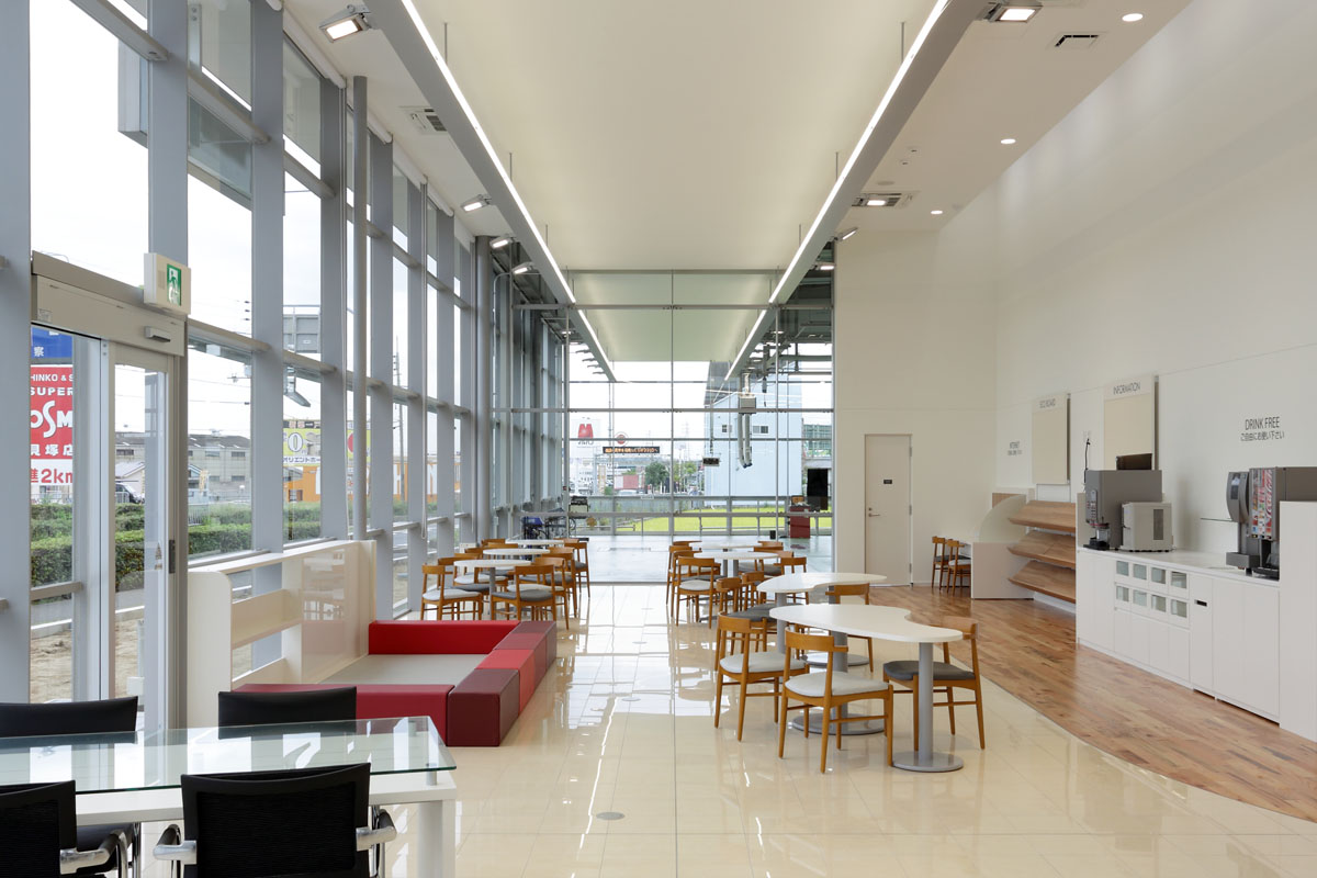 ショールームと整備工場はガラス一枚で連続しており、整備の様子があたかもショーケースのように美しく眺められます。